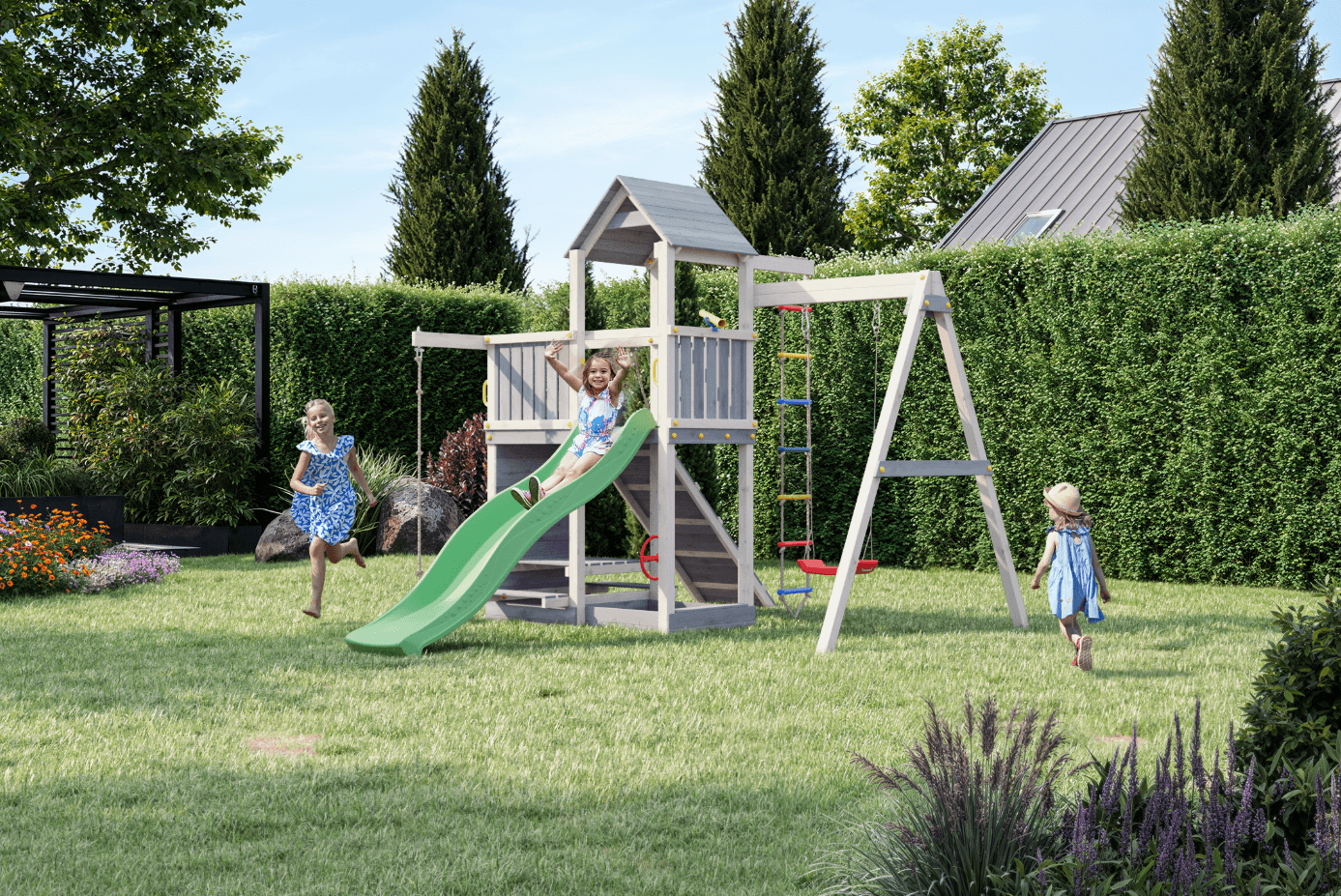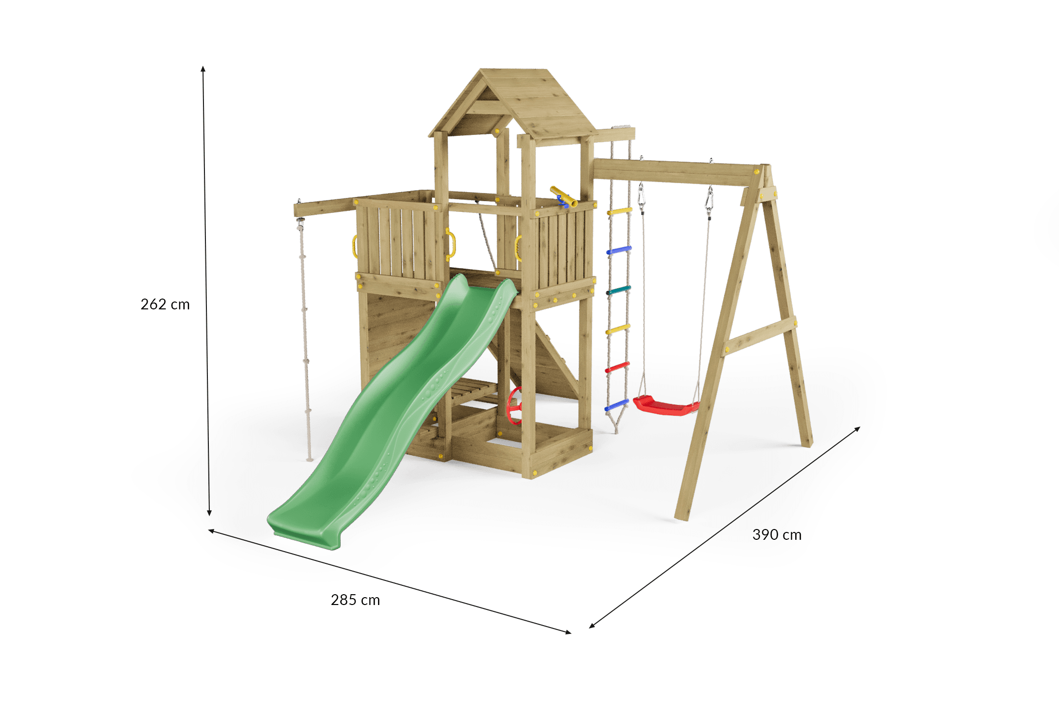 Das FUNGOO ACTIVER KDI Spielgelände aus langlebigem, imprägniertem Holz fügt sich nahtlos in jeden Garten ein und bietet zahlreiche Funktionen wie eine Kletterrampe, eine Kletterwand und eine Strickleiter, die zu endlosem fantasievollem Spiel anregen. Dieses Spielset wurde unter Berücksichtigung der Sicherheit entwickelt und bietet einen sicheren und aufregenden Abenteuerspielplatz im Freien für aktive Kinder.