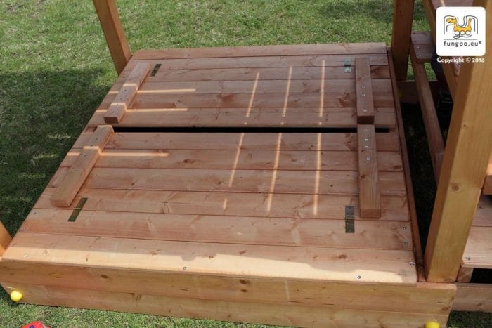 Das BEACH-Modul ist ein Satz von 2 Sandkastenabdeckungen, die sich in eine Bank mit Rückenlehne verwandeln lassen.